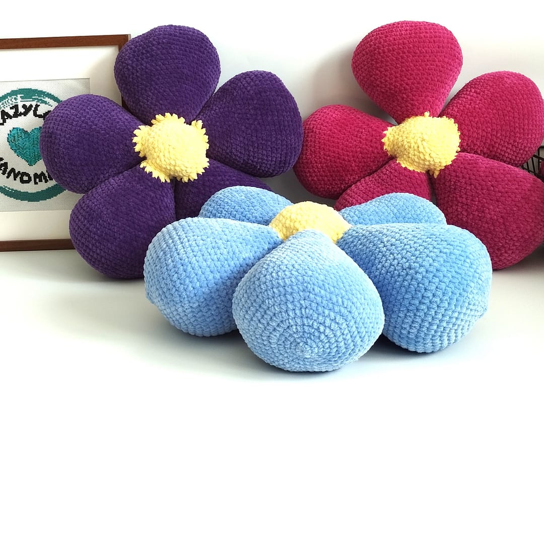 Poduszka kwiatuszek zrobiona na szydełku.
