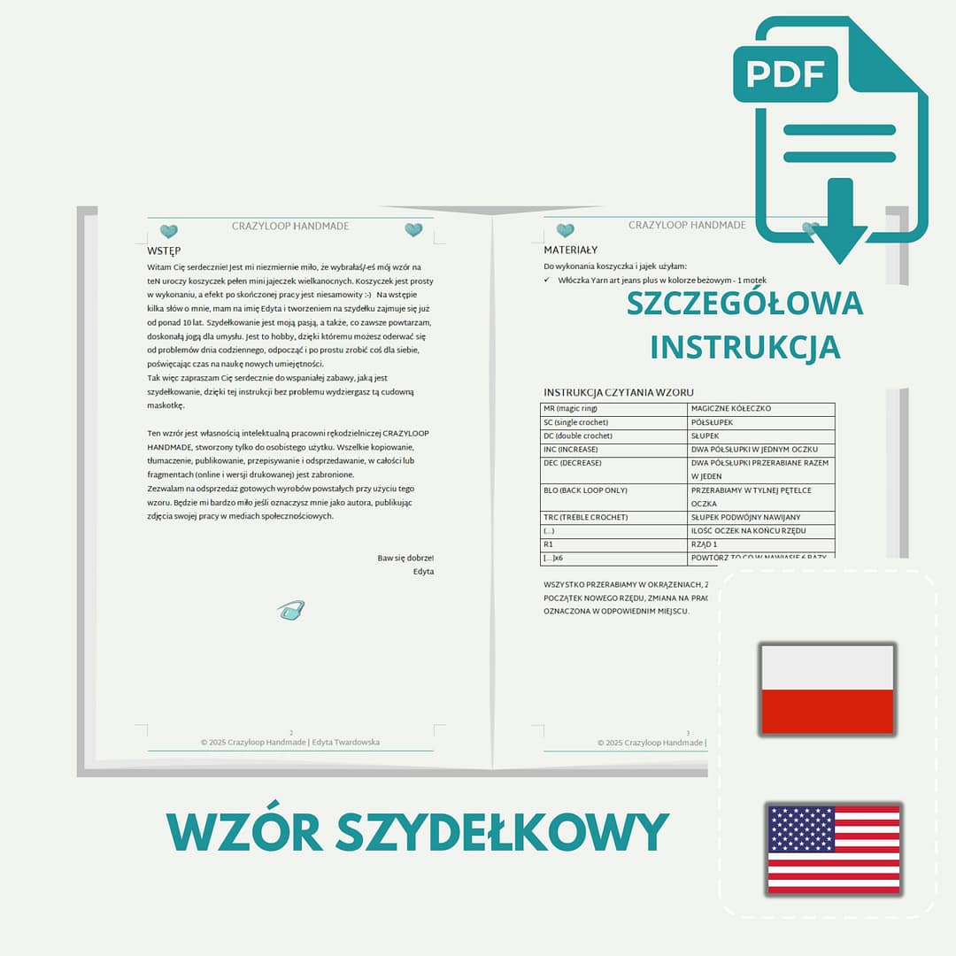 Moje wzory, jak i wszystkie inne produkty, powstają z najwyższą precyzją i starannością. Piszę wzory tak, jakbym chciała dla siebie mieć rozpisane. Wszystko jest jasne i czytelne. Dokładnie opisany każdy krok po kolei, wzbogacone odpowiednimi zdjęciami kolejnych etapów pracy. Wzory piszę w terminologi amerykańskiej, co oznacza, że skróty, których używam są po angielsku (w każdej wersji językowej wzoru). Na początku instrukcji, w tabeli tłumaczę Ci, co oznacza każdy użyty skrót, by łatwo Ci było śledzić instrukcję.
