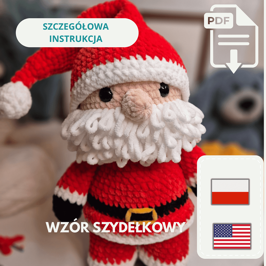 Wzór w formacie PDF, napisany w bardzo przystępny sposób, zawiera wskazówki jak, krok po kroku, wykonać Świętego Mikołaja na szydełku. Dodatkowo szczegółowe zdjęcia opisujące poszczególne kroki wykonania. Wszystko to zostało wytłumaczone na 14 stronach bardzo dokładnej instrukcji.